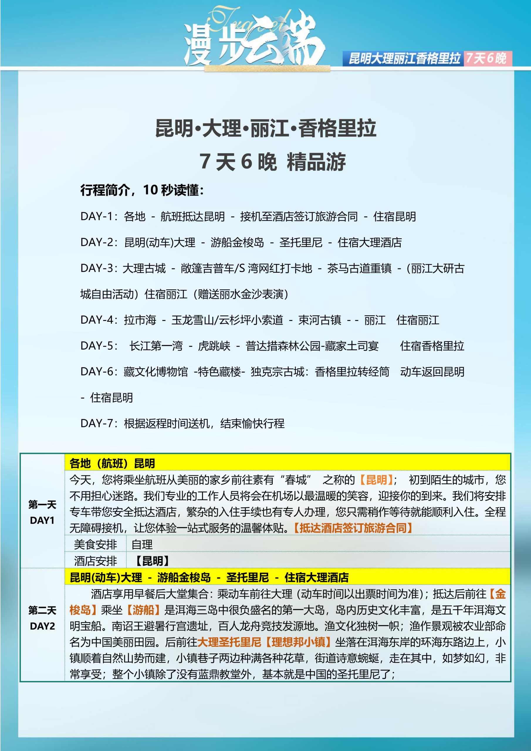 立即联系我们预定,确保您的位置,享受云南最精致的旅游体验。我们的7天6晚行程包括昆明、大理、丽江和香格里拉的经典景点,让您在旅途中领略大自然的魅力与文化的深度。我们为您精心准备了每一环节,只为让您的旅行更加完美。